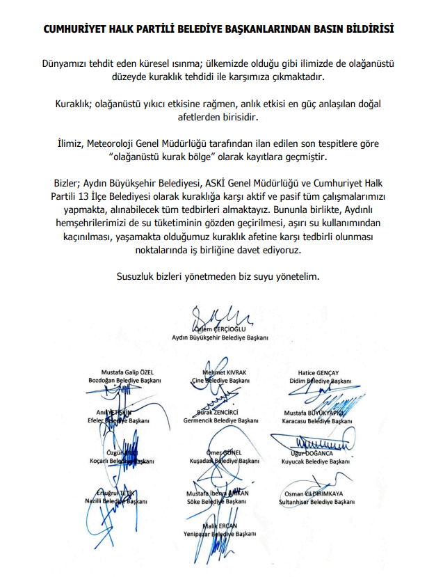 “Dünyamızı tehdit eden küresel ısınma; ülkemizde olduğu gibi ilimizde de olağanüstü düzeyde kuraklık tehdidi ile karşımıza çıkmaktadır.Kuraklık; olağanüstü yıkıcı etkisine rağmen, anlık etkisi en güç anlaşılan doğal afetlerden birisidir. İlimiz, Meteoroloji Genel Müdürlüğü tarafından ilan edilen son tespitlere göre “olağanüstü kurak bölge” olarak kayıtlara geçmiştir. Bizler; Aydın Büyükşehir Belediyesi, ASKİ Genel Müdürlüğü ve Cumhuriyet Halk Partili 13 İlçe Belediyesi olarak kuraklığa karşı aktif ve pasif tüm çalışmalarımızı yapmakta, alınabilecek tüm tedbirleri almaktayız. Bununla birlikte, Aydınlı hemşehrilerimizi de su tüketiminin gözden geçirilmesi, aşırı su kullanımından kaçınılması, yaşamakta olduğumuz kuraklık afetine karşı tedbirli olunması noktalarında iş birliğine davet ediyoruz. Susuzluk bizleri yönetmeden biz suyu yönetelim”
