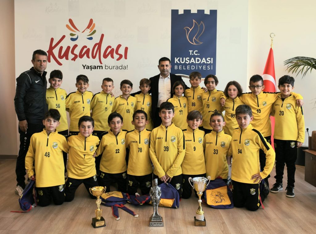 İstanbul Cup’ta U-10 yaş grubu kategorisinde Türkiye 2’ncisi olarak kente büyük bir gurur yaşatan Güvercinada Spor Kulübü’nün küçük futbolcuları, aileleriyle birlikte Kuşadası Belediye Başkanı Ömer Günel’i makamında ziyaret etti. Geleceğin yıldız adaylarına çeşitli hediyeler verip, tebrik eden Başkan Ömer Günel, “Başarılı sporcuların her zaman yanındayız” dedi.