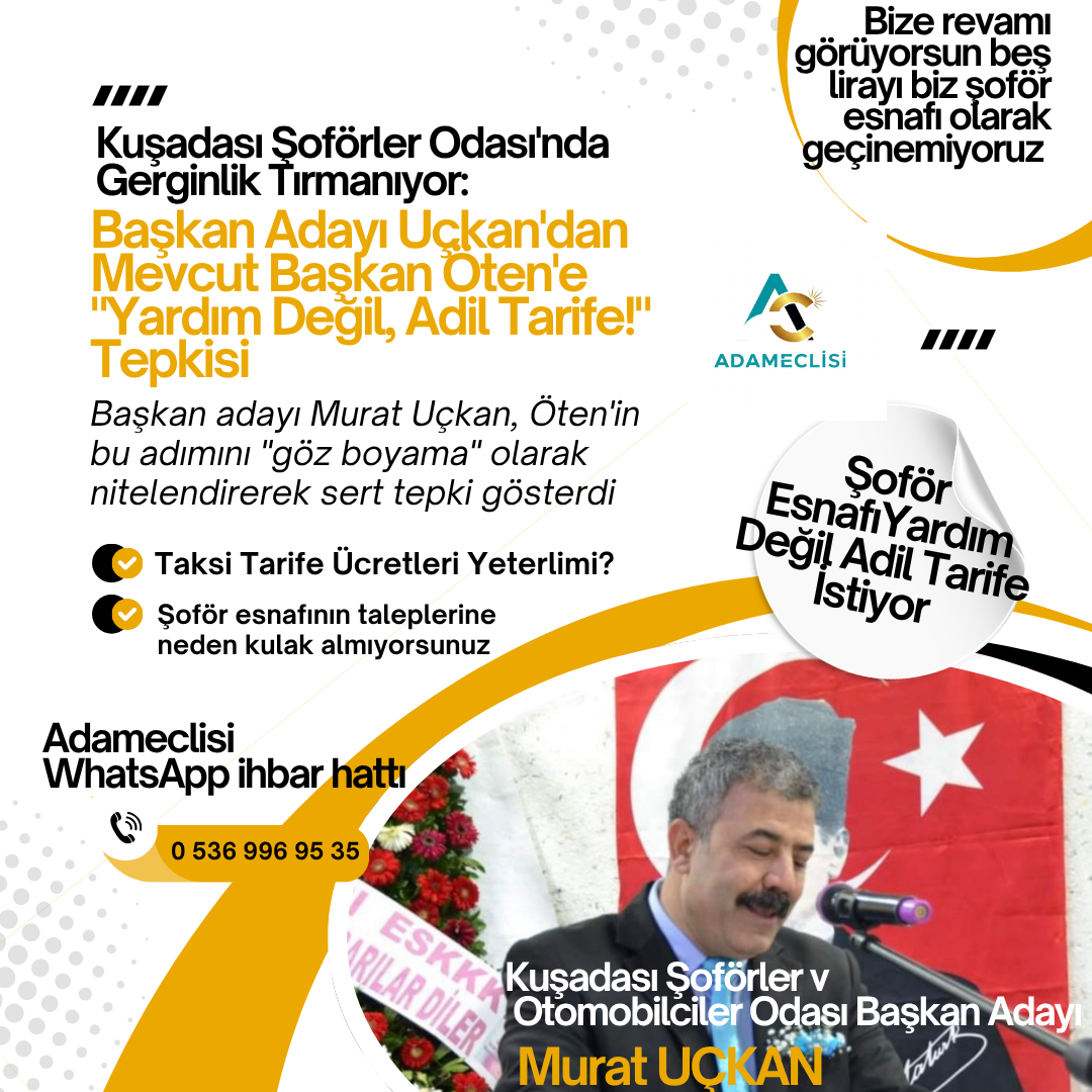 Başkan adayı Uçkan, Öten’in bu adımını “göz boyama” olarak nitelendirdi. “Şoförlere yardım etmeyi bırakın; onlar paralarını kendi alın terleriyle kazanırlar. Siz taksimetre ücretlerini adil hale getirin!” diyen Uçkan, şoför esnafının giderlerinin %100 arttığına dikkat çekti.