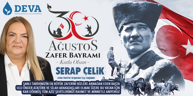 Deva Partisi Kuşadası İlçe Başkanı Serap ÇELİK 30 Ağustos Zafer Bayramı’nın 102. Yıl dönümü dolayısıyla yayımladığı mesajında, “30 Ağustos Zaferi yok edilmek istenen bir milletin yeniden doğuşunun en önemli göstergesidir” dedi.
