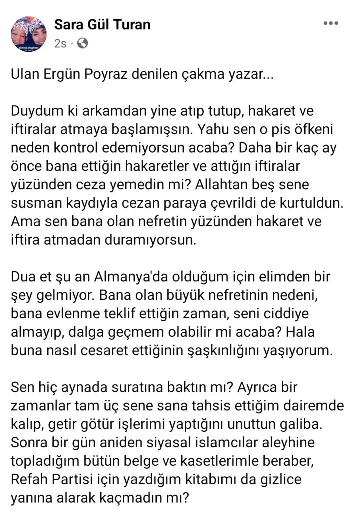 Yazar Sara Gül Turan yazısına “Ulan Ergün Poyraz denilen çakma yazar…“diyerek başladı