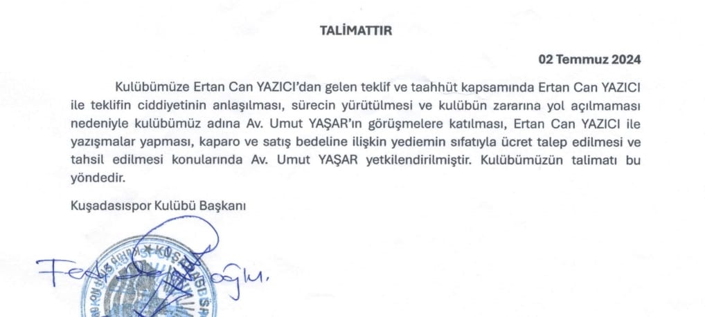 Kuşadası Spor Kulübü’nün devir işlemlerinin yürütülmesi, alıcılar ile görüşülmesi gelen teklif ve taahhütnameler uyarınca işlem yapılması, devir için yediemin sıfatıyla ücret kabul etmesi ve devir bedelini veya kapora bedelini talep etmem için müvekkilimden talimat ve yetki aldım. Kulüp tarafından verilen talimatı da paylaşıyorum. Aldığım yetki ile