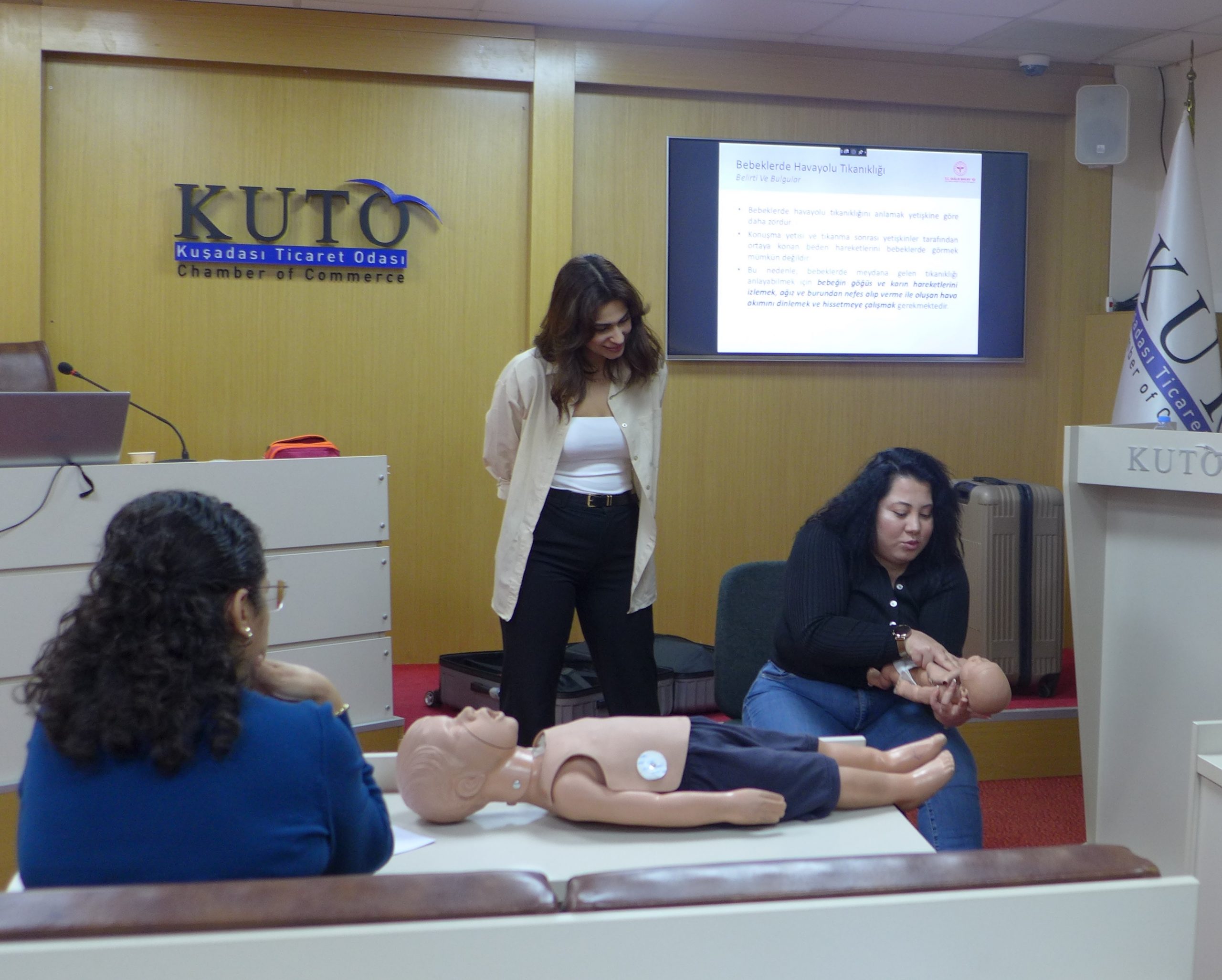 Aydın İl Sağlık Müdürlüğü ve Kuşadası Ticaret Odası işbirliğinde gerçekleşen eğitim, Sağlık Hizmetleri Başkanlığı Acil Sağlık Hizmetleri Birimi Eğitmenleri Aysel Kural ve Gökhan Ceylan tarafından verildi.