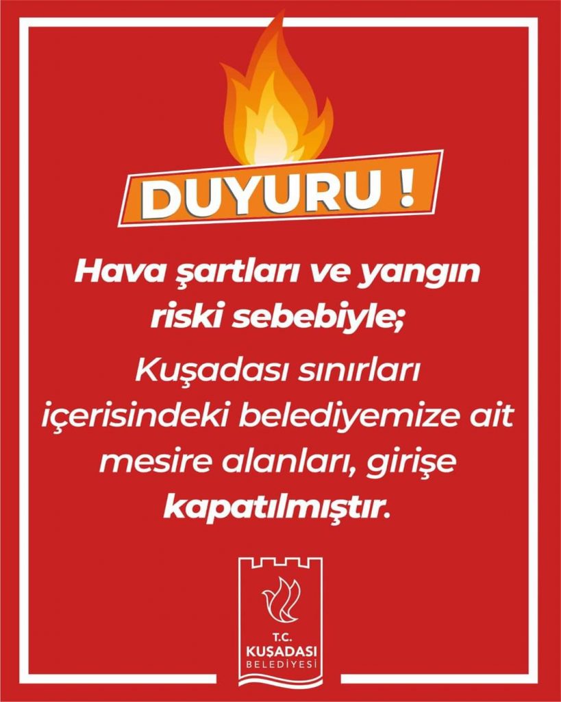 Kuşadası Belediyesi, Türkiye’nin pek çok kentinde etkili olan orman yangınlarına karşı tedbir amaçlı olarak Başkan Ömer Günel’in talimatıyla kentte başta Sevgi Plajı olmak üzere Adagöl ve belediyenin sorumluluğunda olan tüm diğer mesire alanlarında mangal ve semaver yakılmasını yasakladı. Yasak, yangın riskini artıran olumsuz hava koşulları düzelene kadar devam edecek.