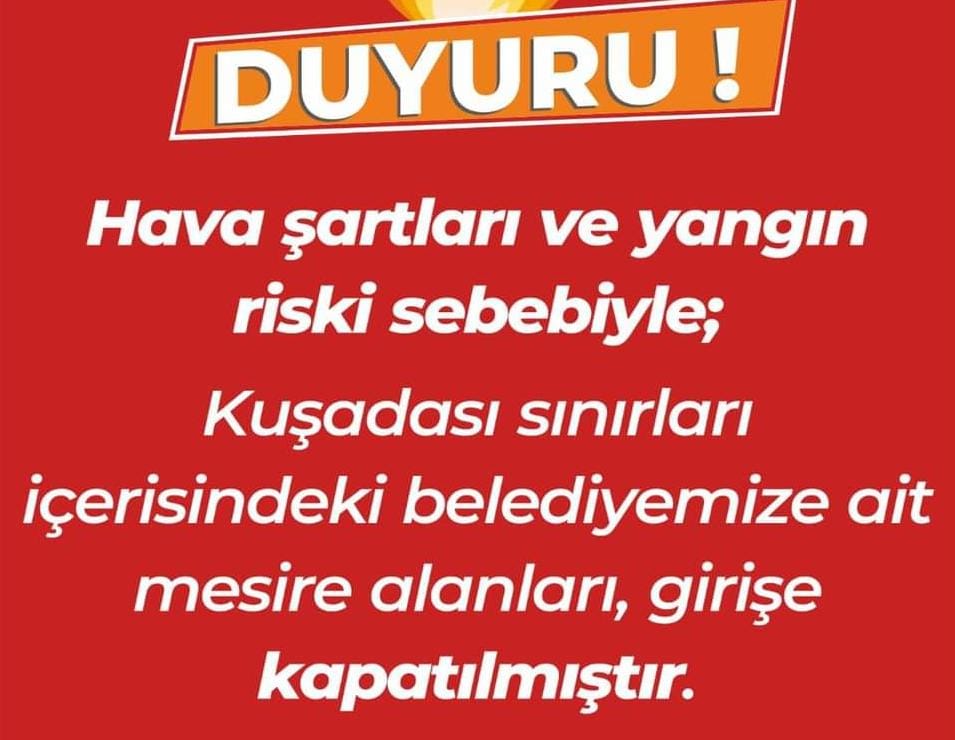 Kuşadası Belediyesi, Türkiye’nin pek çok kentinde etkili olan orman yangınlarına karşı tedbir amaçlı olarak Başkan Ömer Günel’in talimatıyla kentte başta Sevgi Plajı olmak üzere Adagöl ve belediyenin sorumluluğunda olan tüm diğer mesire alanlarında mangal ve semaver yakılmasını yasakladı. Yasak, yangın riskini artıran olumsuz hava koşulları düzelene kadar devam edecek.