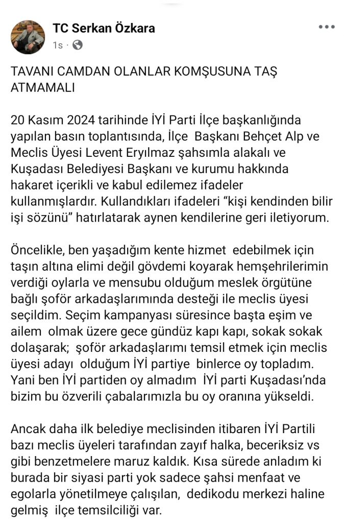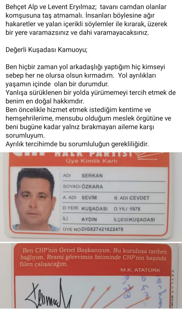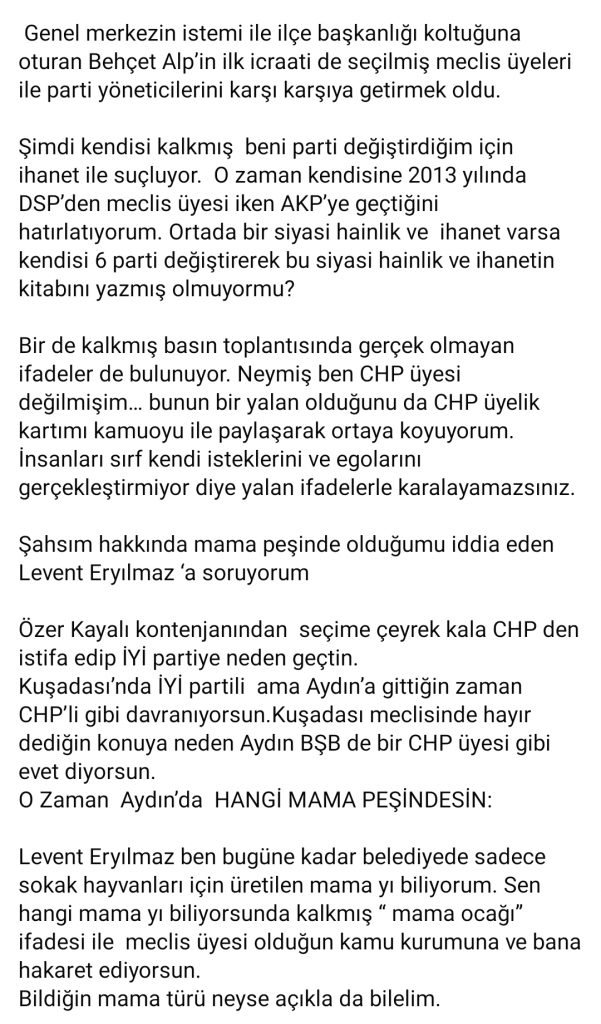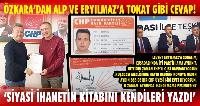 Yalan ve iftiralarla dolu basın toplantısında hakkında yapılan eleştirilere sert yanıt veren CHP Kuşadası Mecli Üyesi Serkan Özkara, ‘Siyasi ihaneti en iyi sen bilirsin’ diyerek Behçet Alp’e seslendi. Özkara, ‘mama’ ifadesi ile uğradığı alçak iftira için de Levent Eryılmaz’a tokat gibi cevap verdi.