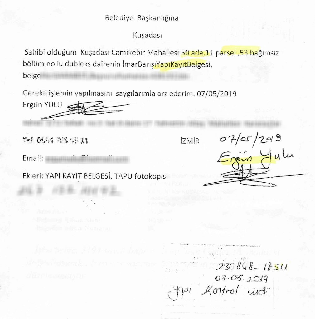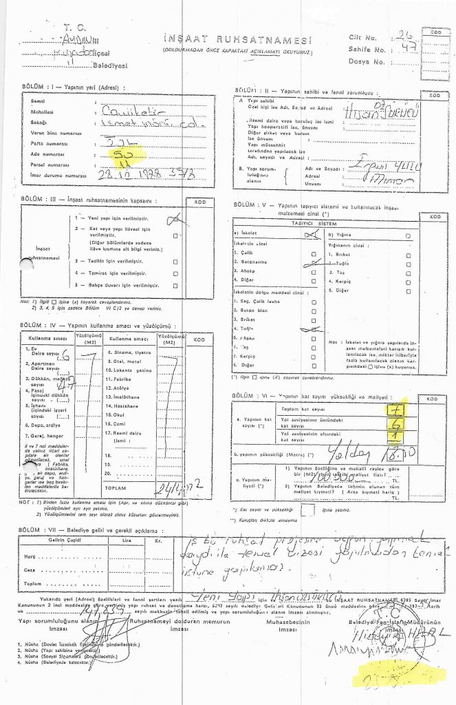 50 ADA 11 PARSELDE BULUNAN ve MİMAR ERGÜN YULU TARAFINDAN YAPILAN BİNANIN BİR KATI KAÇAKTIR. ERGÜN YULU’NUN 53 NOLU MESKENİ İÇİN ÇEVRE VE ŞEHİRCİLİK BAKANLIĞI TARAFINDAN ALDIĞI YAPI KAYIT BELGESİ USULSÜZDÜR.