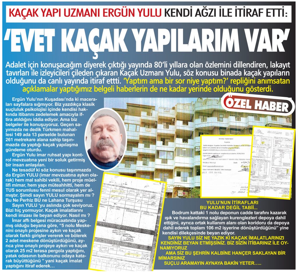 Utanmazlığın ve umarsızlığın timsali, kural tanımayan kaçak yapı uzmanı Ergün Yulu meydanı boş bulmuş olacak ki yargı yoluyla basını susturmaya Kuşadası halkının da gerçekleri öğrenme hakkını gasp etmeye kalkmış… Bir ülkede arsızlar namusludan fazla ses çıkarıyorsa o sesi susturmak ve doğruları halka iletmek biz basın mensuplarının asli görevidir. Yaptığı kaçak yapının itirafını dahi yapan kural tanımaz kaçakçı için belediye ve yargı ne zaman harekete geçecek?
